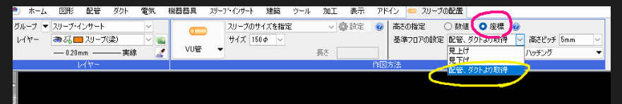 CADソフトのメニューからスリーブ挿入機能を起動します