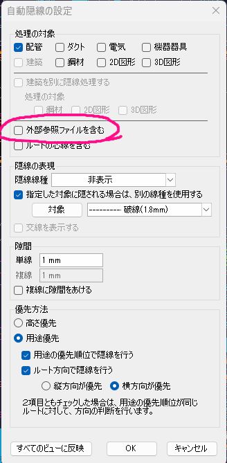 1. 自動隠線の設定を開きます 2. 「外部参照ファイルを含む」のチェックを外します |