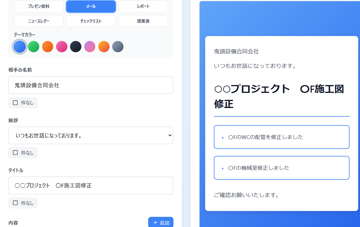 入力内容は即座にプレビューに反映されます。完成イメージを確認しながら作業できます。